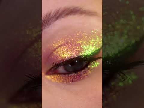 Color: Bright pink base with purple, green-gold, and coral-orange multichrome effect. Super sparkly shimmer Multichrome eyeshadow with large particle texture.