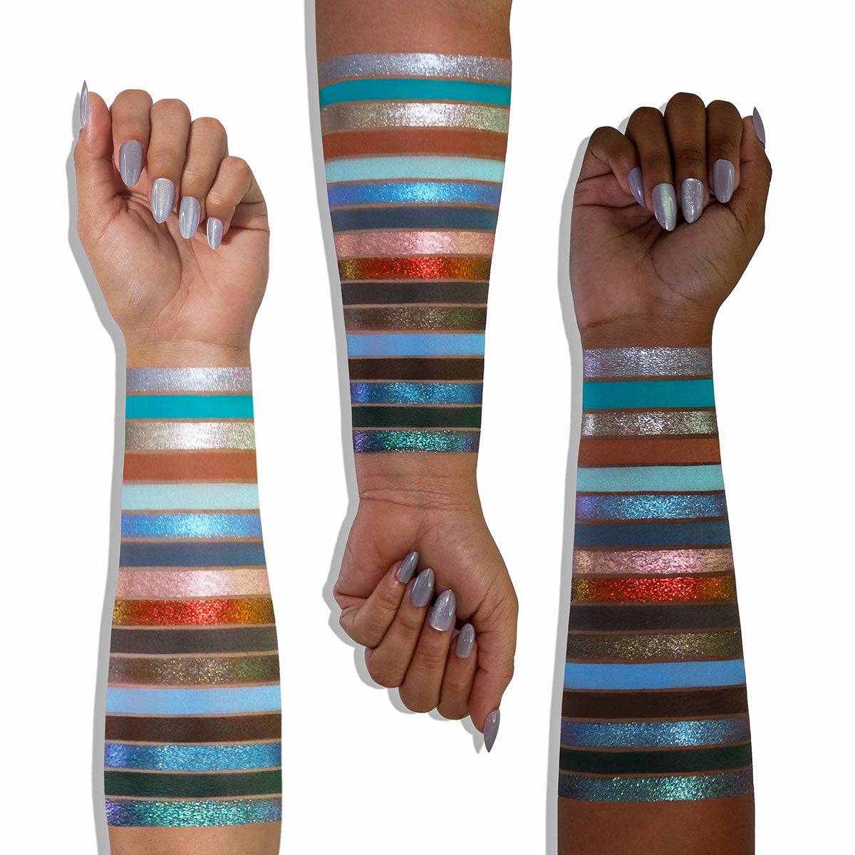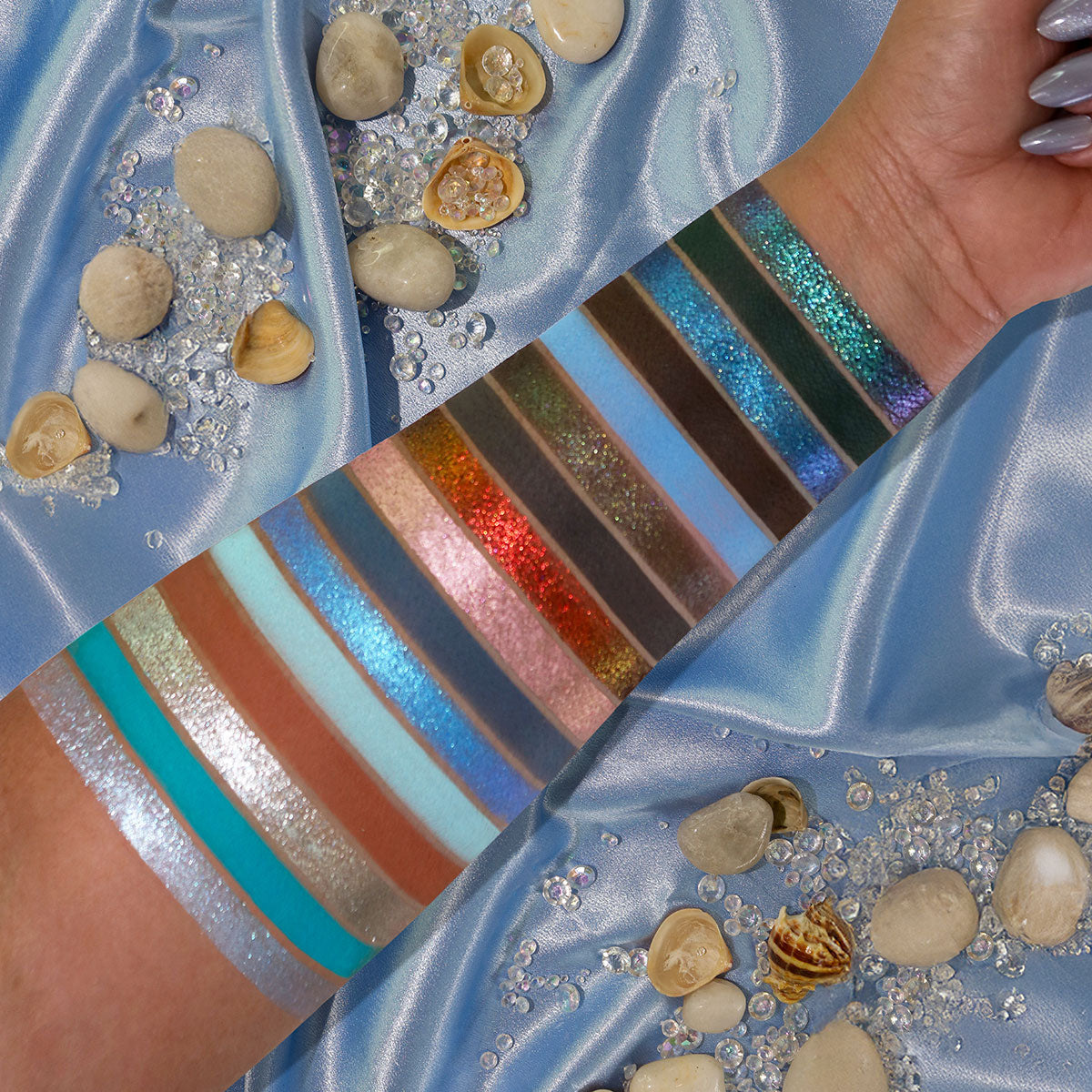 16 colors, including four different textures: 8 matte eyeshadows, 6 diamond glitter eyeshadows, 1 handcrafted shimmer eyeshadow with a unique pattern and 1 multi-chrome eyeshadow.