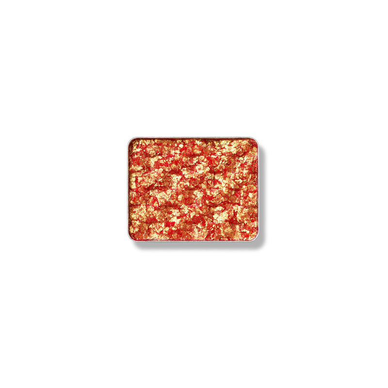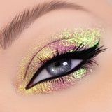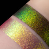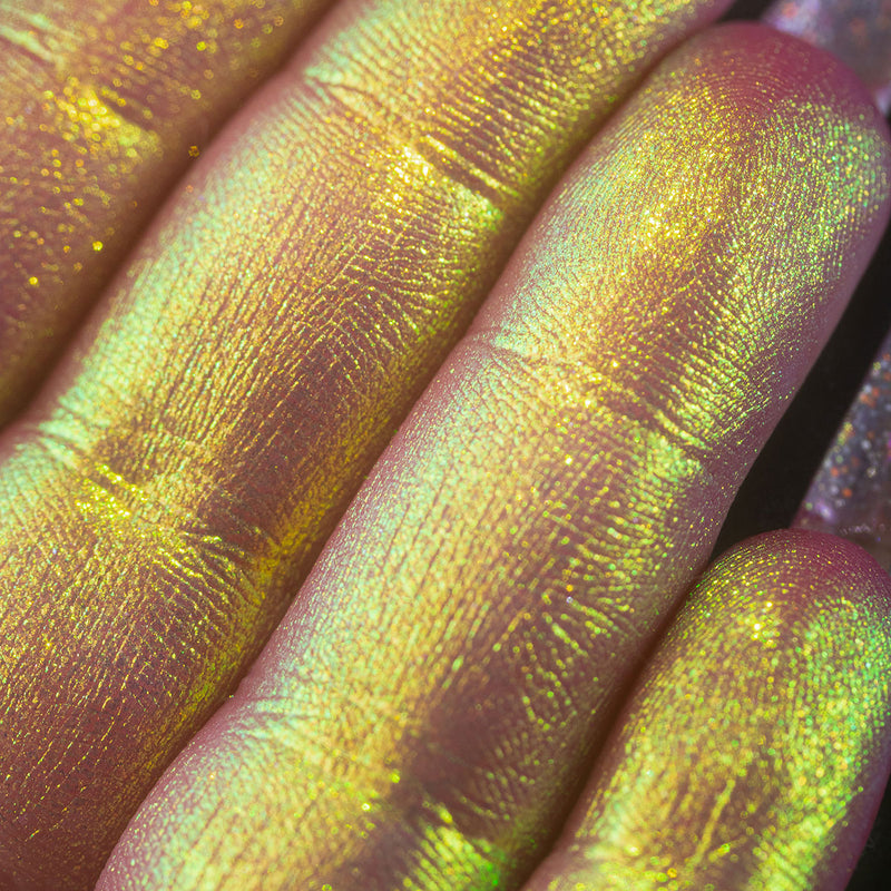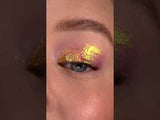 Color: Bright pink base with purple, green-gold, and coral-orange multichrome effect. Super sparkly shimmer Multichrome eyeshadow with large particle texture.