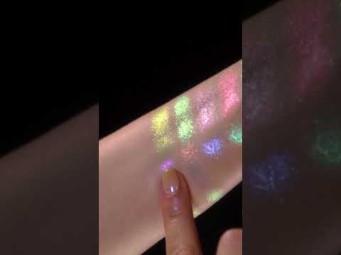 M018 Lily: Light yellow base with hints of light green, gold, and soft pink multichrome effect. Bright metallic shimmer Multichrome eyeshadow.